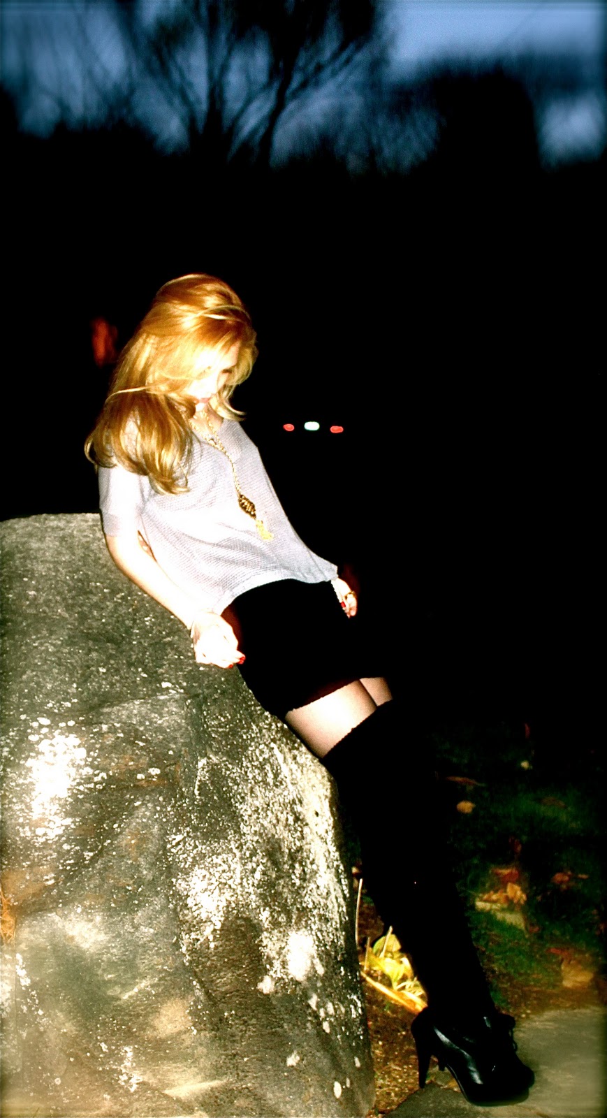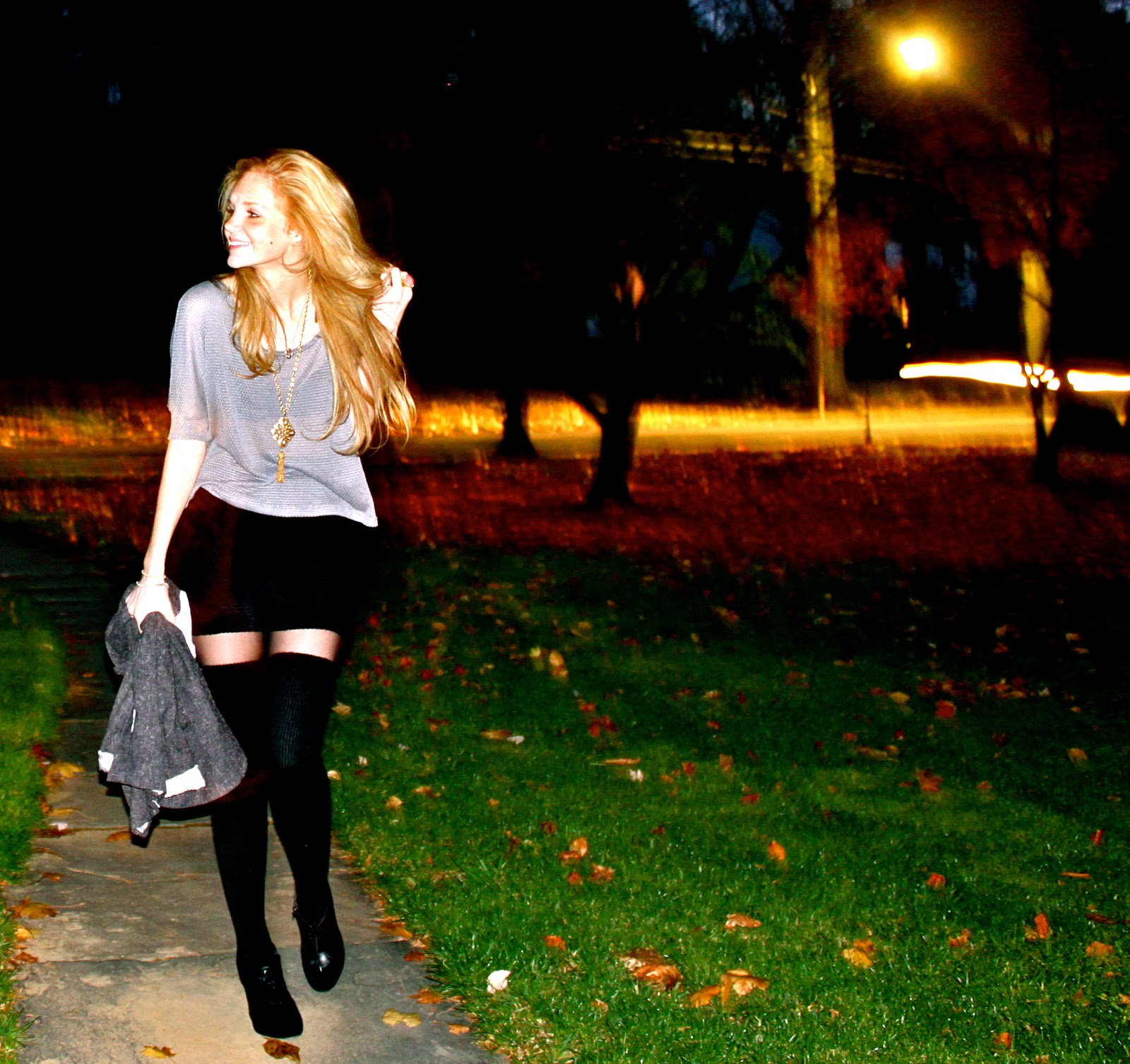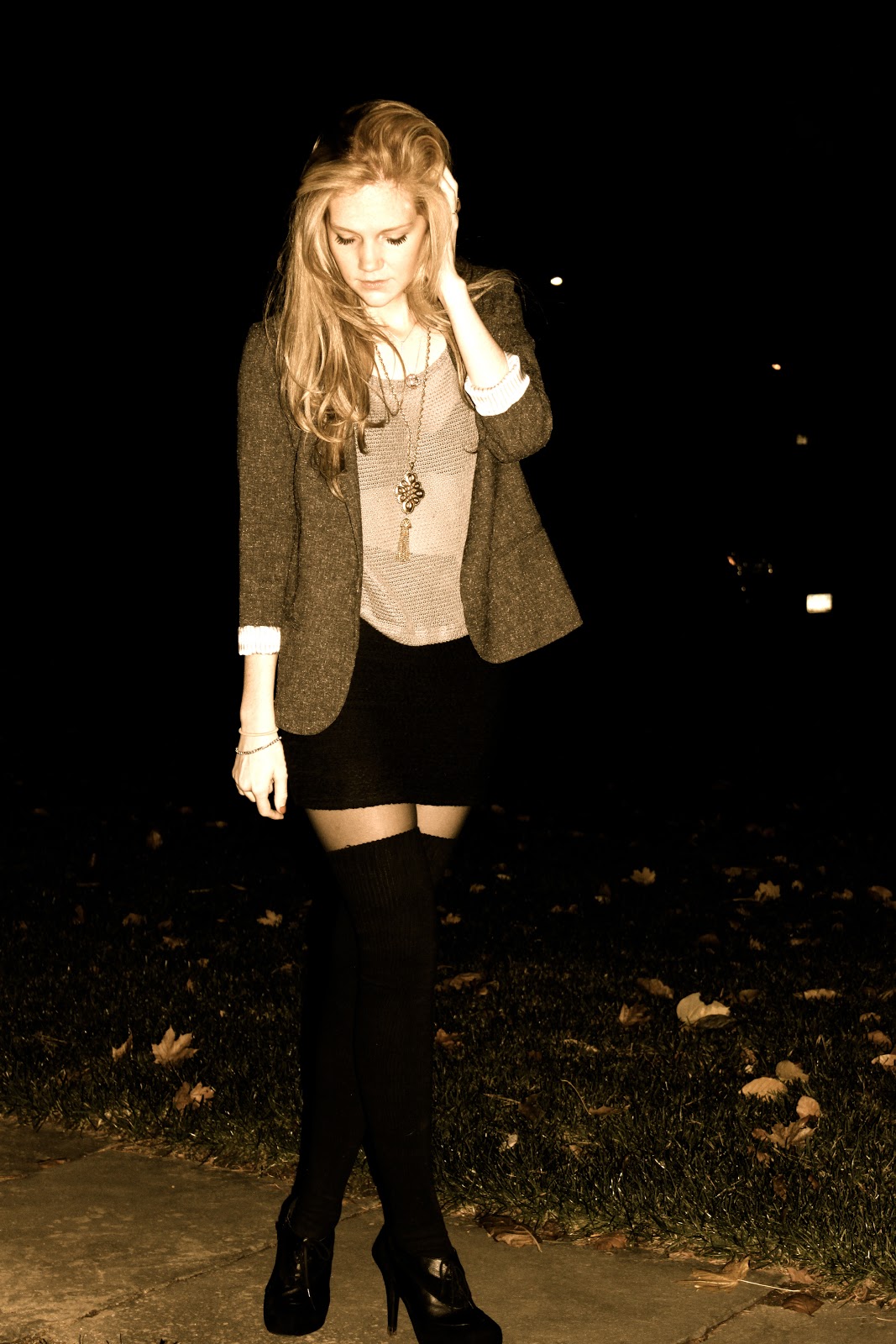 I finally have all my clothes and shoes put away as of today... or so I thought. Several boxes of my winter-wear and nicest shoes have vanished under my mother's watch. She claims to remember boxing them up when my parents cleaned up the house and put it on the market this past summer. A whole slew of things went into storage. This was allegedly where I would find my things. Not so. Thus, the search continues for the boxes that contain my super-luxe black cashmere cowl-neck sweater and my chalky brown suede fold-over cuff booties. I should establish a reward for their recovery! Perhaps that might incite little more urgency into the attention of the search party... Good news though! Though my precious treasure chest of apparel is missing in action, I did stumble upon my grandmother's vintage fur stole in one of the wardrobe boxes marked "Dress-ups." Hah! Dress-ups! Please, this puppy is meant to be worn in the real world. Don't you agree? For now though I am making do with the clothes I have and the weather I am given. A basic black bandage skirt (ok maybe not SO basic, the high waist and the ruffled texture add a little extra) paired with a loose and open-knit thin sweater is an easy ensemble that effectively toes the line between dressy chic and casual. I added a pair of sheer black pantyhose and my black American Apparel thigh-high socks to warm up my extra long leggies. My oxford-style booties are from Buffalo Exchange in Austin. They have a small hidden platform underneath the ball of my foot so they're much more comfortable to walk in than they look. The finishing touches to any outfit I put on usually come from a last minute stroll through my mother or sister's room. In this case, I stole my sister's nubby charcoal gray boyfriend blazer and snagged a vintage gold medallion tassel necklace out of my mom's jewelry stand. The chunky pink cocktail ring is my own, however, and hails from my beloved fashion heaven: Forever 21.