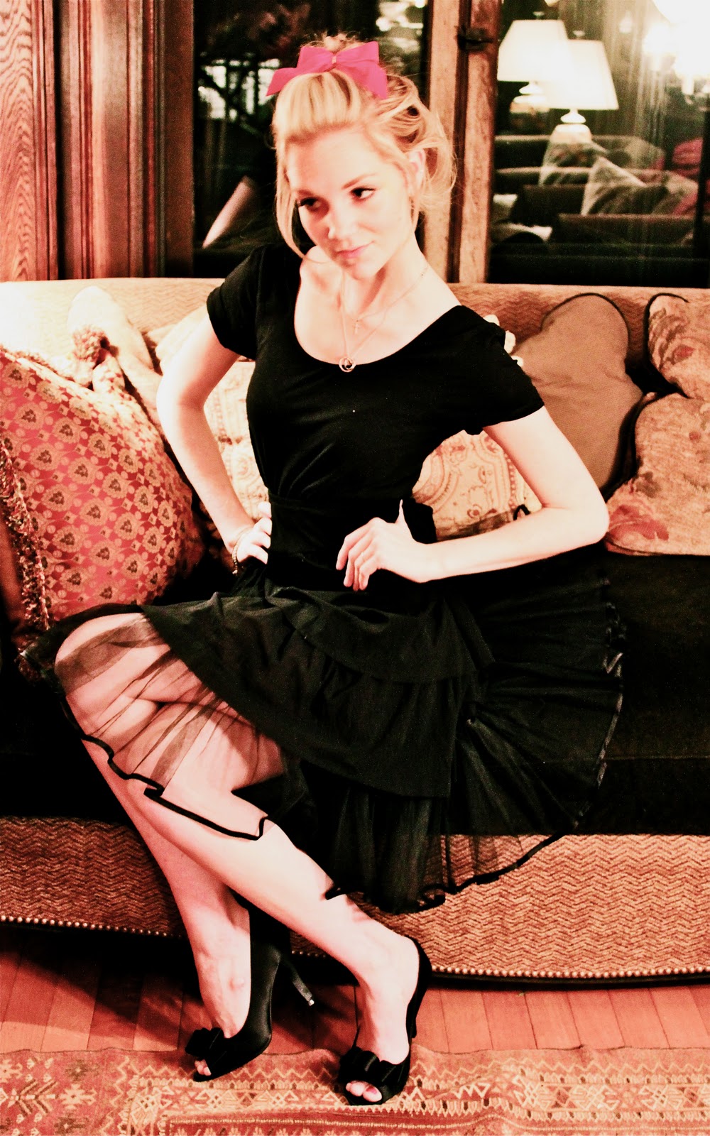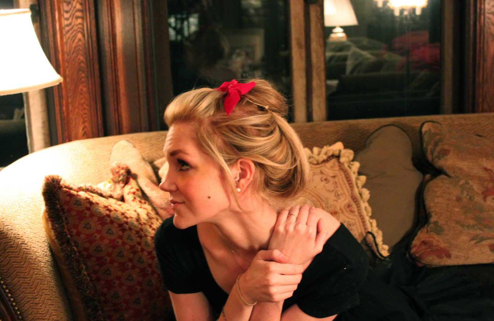 I used a classic red velvet Christmas bow in the first set, here. I put my goldie locks up into a loose, tousled version of a ballerina bun. The front pieces were pinned back into a chic pouf (no Snooki versions here, please...). All it took was a couple bobby pins to secure the bow right behind the bump and resting against the front of my bun, and voila! The resulting look is innocent and demure but very festive and fun.