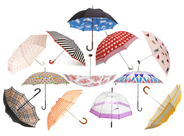 From top, left to right: Blue Sky Printed Umbrella, Urban Outfitters; Dusty Pink Bunny-Print Crook-Handle Umbrella, Topshop; Black and Cream Striped Umbrella, Kate Spade; Red Hearts Umbrella, Moschino Cheap and Chic; Marc by Marc Jacobs Jumbled Birds Umbrella, Net-A-Porter; Neon Geometric-Print David David Blocker Walking Stick Umbrella, Coggles; English Rose Tiny Umbrella, Cath Kidston; Blue Geometric Print David David Carousel Walking Stick Umbrella, Coggles; Burberry Regent Double Umbrella, Bloomingdale's; Orange Regimental Stripe Folding Umbrella, Barneys New York; Clear Purple Bubble Umbrella, Urban Outfitters; Yellow Vintage Stripe Folding Umbrella, Barneys New York