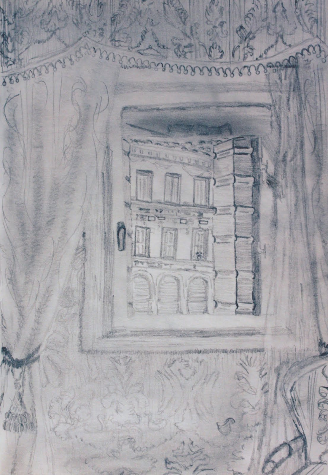 I started out just halfway sketching the doorway to the bathroom in our Florence hotel. I have a tendency to start things and not finish them, as you'll see...